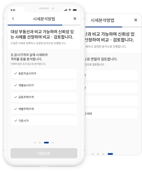 실거래사례와 수십만건의 감정평가된 사례를 직접 수집하고 분석하여 정확하고 공정한 부동산 시세를 제공합니다.